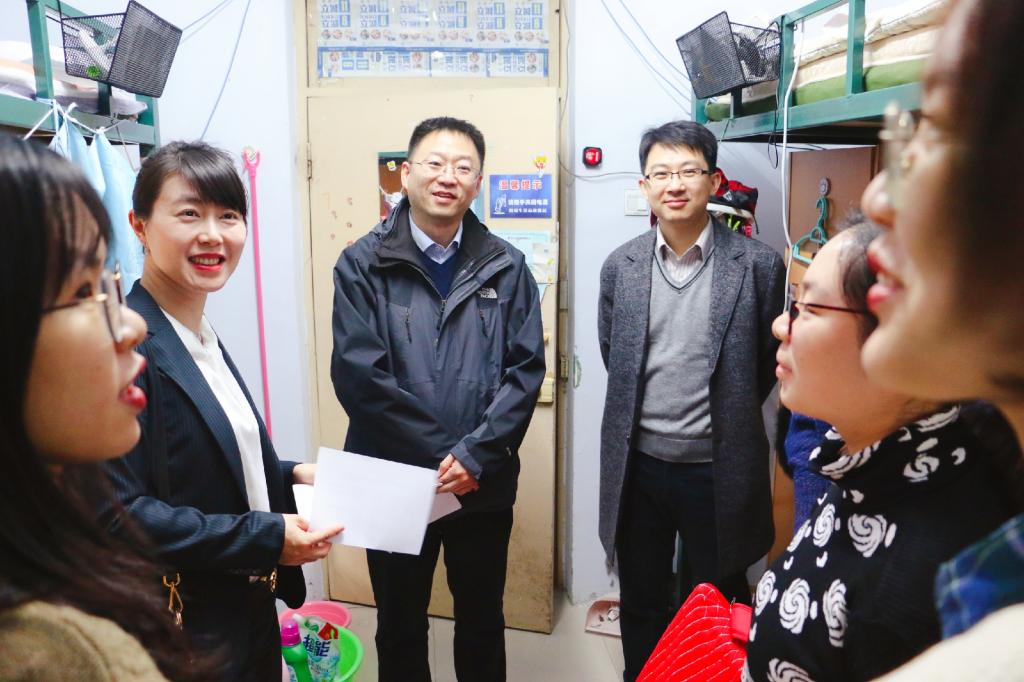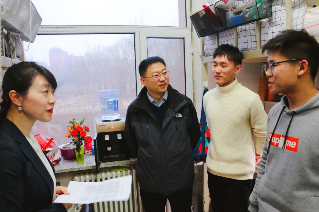 院长肖晞、党总支书记杨民和学生工作相关负责人来到南苑九公寓、基础园一公寓看望同学。