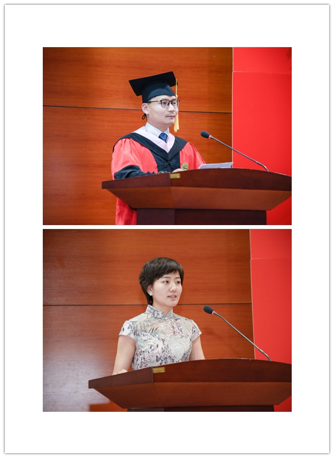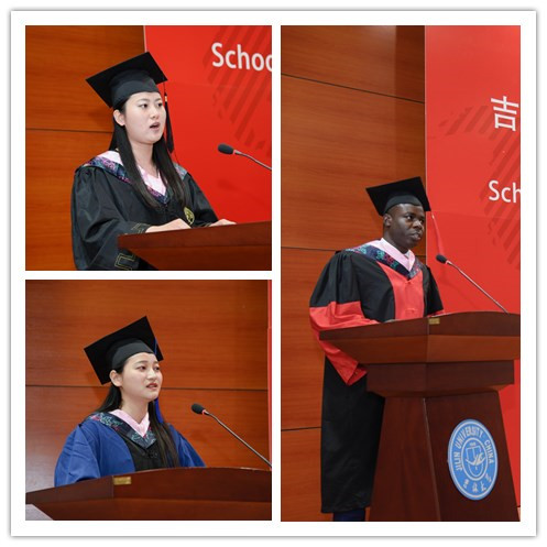 接下来,本科毕业生代表张恒同学、硕士研究生代表戴淑婷同学和留学生毕业生代表小布同学分别发言,代表自己的同学抒发毕业感言。张恒同学说到珍贵的大学时光为同学们与众不同的精彩人生注入了无限的力量,感谢学院赋予了学生逐梦的翅膀,感谢母校为学生们提供了追梦的平台。她勉励同学们在今后的学习和生活中不忘初心,不断突破自我,在治学、处事、为人各方面超越昨天的自己,开启全新的旅程。戴淑婷同学在发言中感慨学院日新月异的蓬勃发展,她表示学院不仅教会学生知识,还为同学们提供了一个多民族、多文化的国际化交流与对话平台,让学生们了解不同民族、宗教与文化,能够以更广博的眼光、更谦逊的态度去看待这个世界。学院教会学生们要常怀对知识、对世界的敬畏之心,这些来自学院各位老师的栽培将是学生们一生中最宝贵的财富。来自加纳的博士研究生小布(BRIGHT LUMOR MENSAH)同学代表毕业留学生感谢学院和自拍偷拍