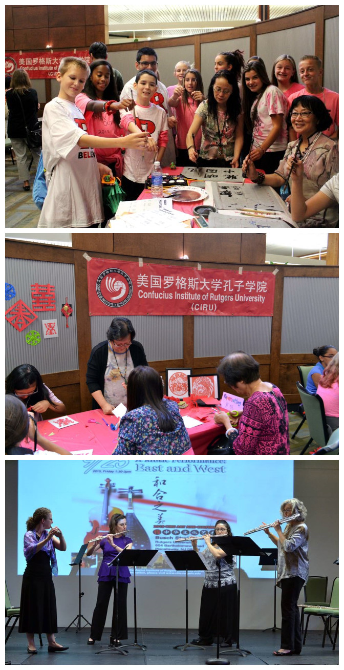9月25日,美国新泽西州立罗格斯大学孔子学院在罗大布什校区(Busch Campus)的学生活动中心举办了庆祝“孔子学院日”大型系列文化活动。此次活动以“沟通与理解”为主题,以中国文化艺术节、“中国味道”美食节、以及“和合之美”中西交响音乐会三场大型活动来演绎中华文化中“和平”、“和美”的理念,庆祝抗日战争胜利70周年及中国传统节日中秋节的来临。活动现场人头攒动、热闹非凡,吸引了近千名新泽西中小学生、大学生及本地民众。新泽西当地主要华文媒体《世界日报》、《新象》等报社派记者进行了全程跟踪报道,罗格斯大学电视台也对整场活动进行了报道,此次活动得到了各方的好评。
