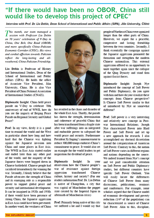 2015年9月5日,应巴基斯坦《外交视野》杂志的约请,刘德斌院长接受该杂志的采访请求,回答了关于中国纪念抗日战争暨世界反法西斯战争胜利七十周年大阅兵、中国软实力、中国的“一带一路”战略、中国的发展经验、中巴关系以及中巴经济走廊的前景等当下热门问题。采访全文刊登在该杂志今年第九期“北京大阅兵&中华人民共和国成立66周年”特刊的显要位置。本期杂志同时收录了自拍偷拍