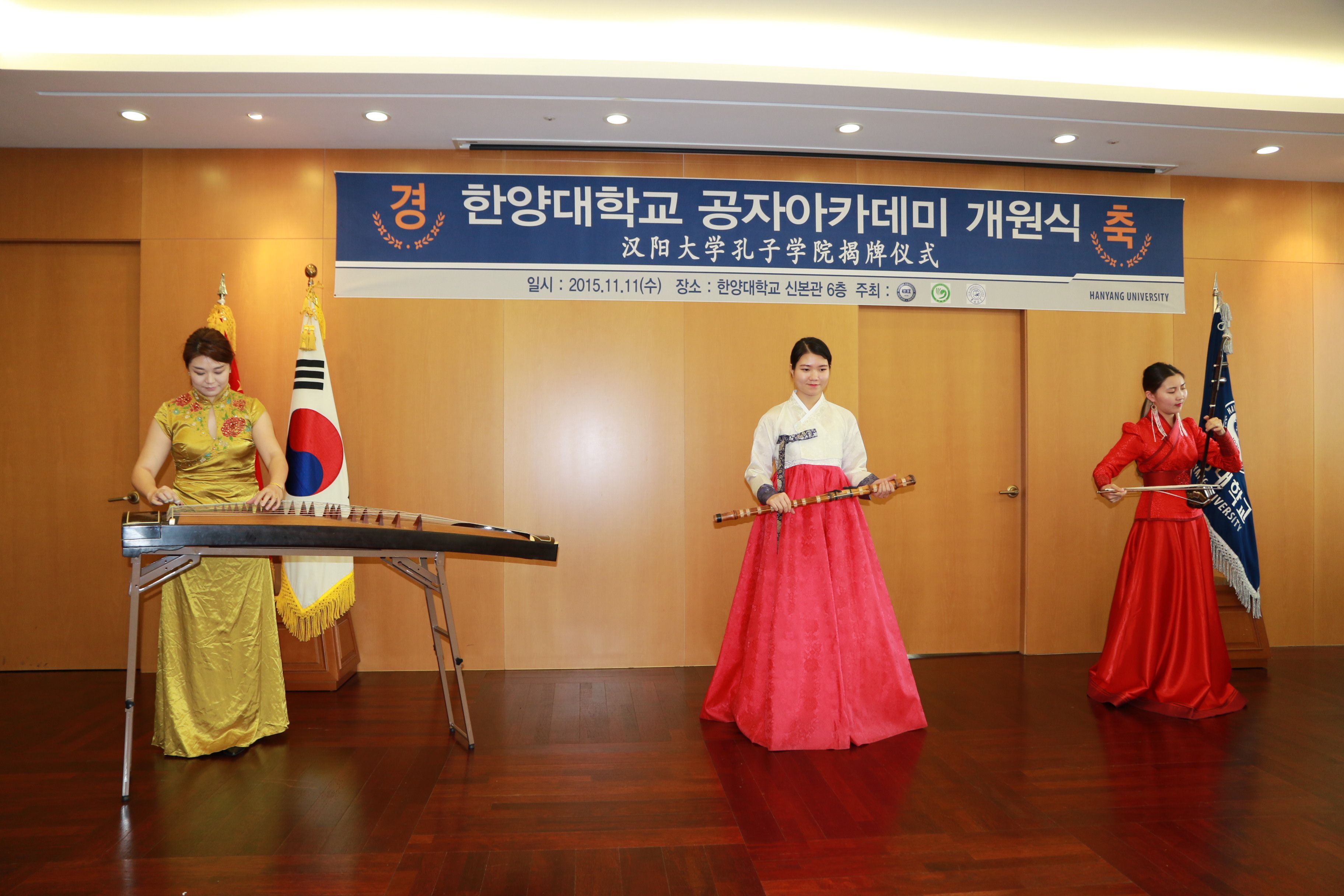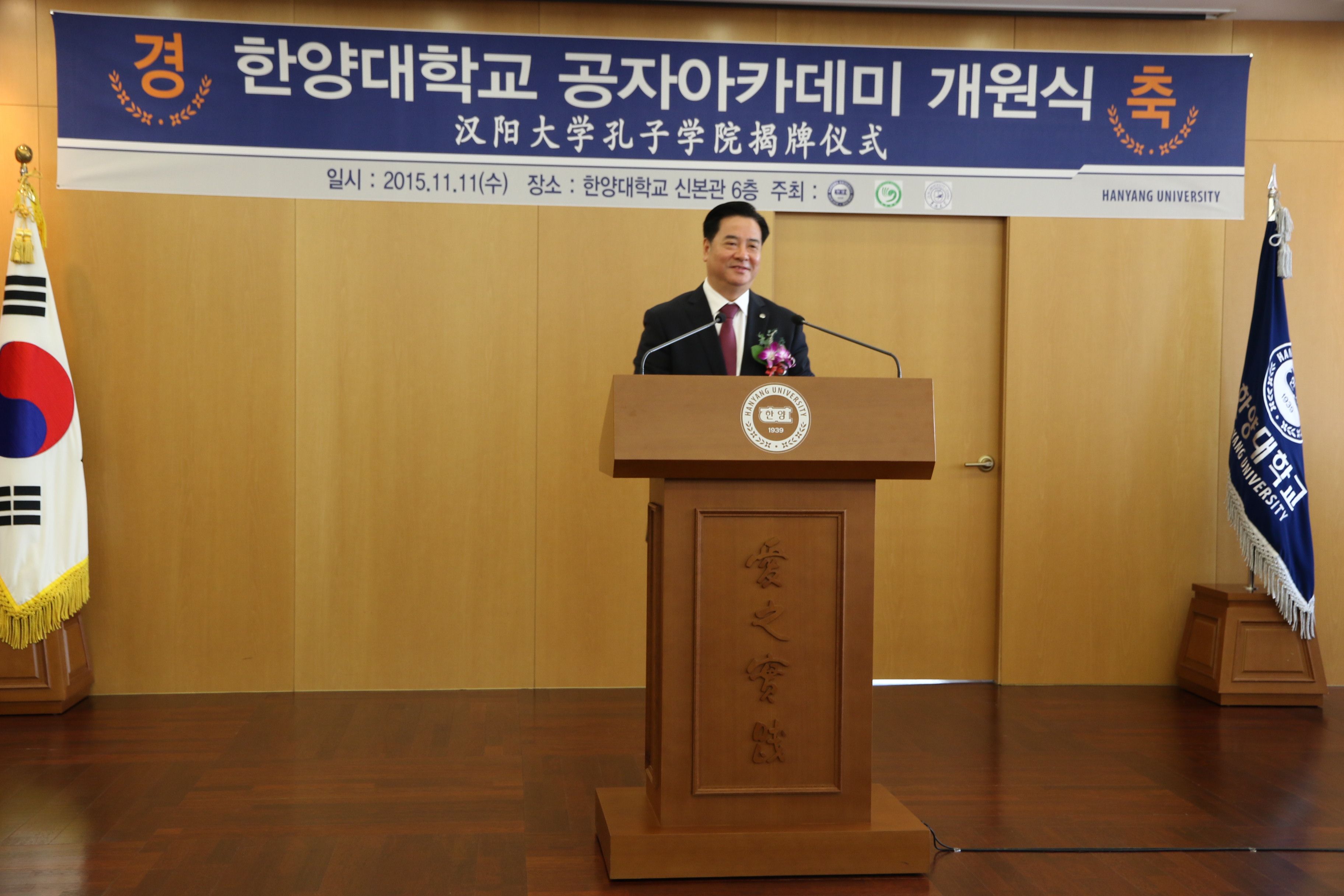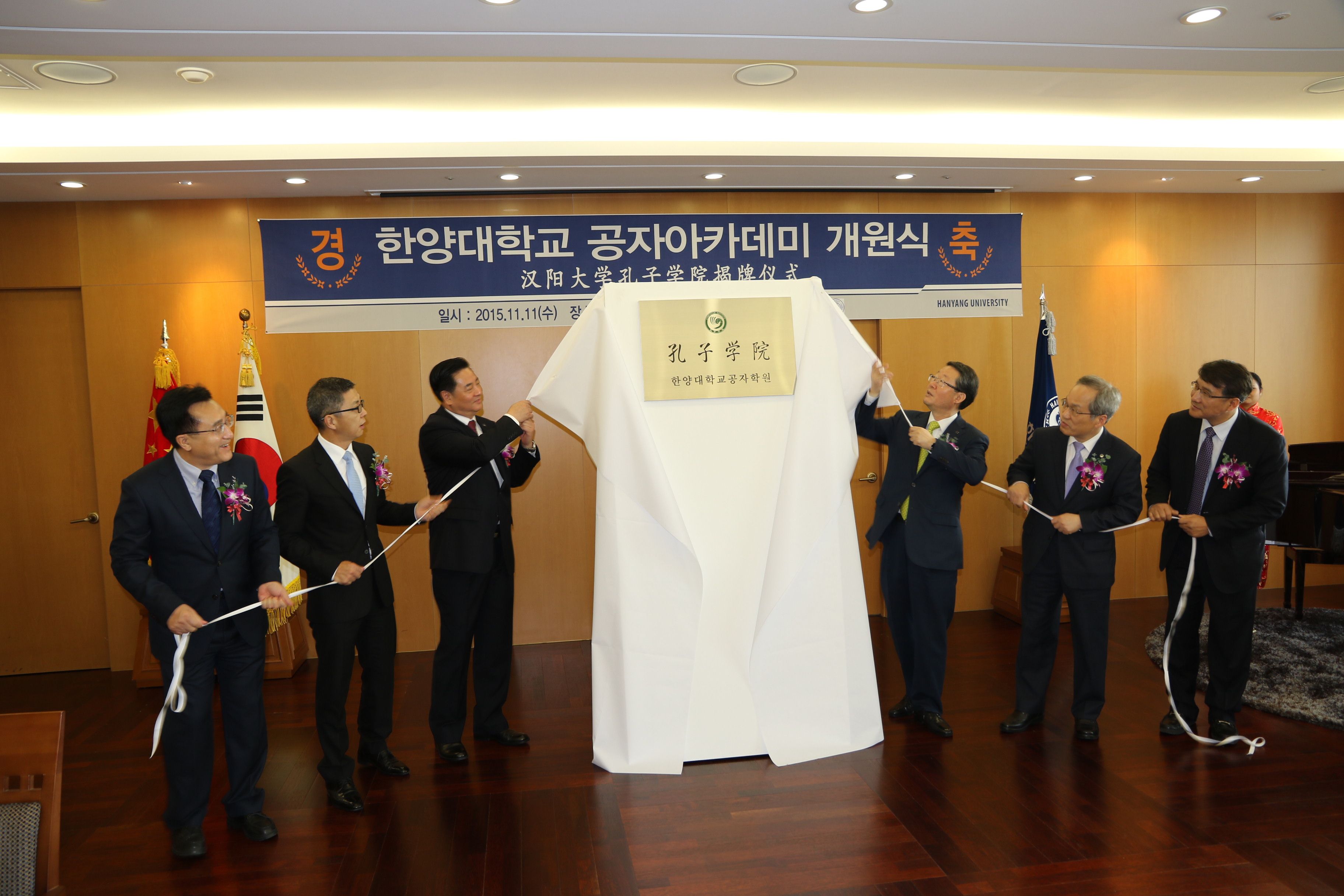 紧接着,在一片热烈的气氛中,汉阳大学孔子学院揭牌仪式隆重举行。李永茂校长在致辞中表示,在当前不可逆转的国际化和全球化的潮流中,“中国”两个字对我们有着格外重要的意义。韩国社会对了解中国社会、政治、经济和文化等领域专家的需求越来越多,汉阳大学孔子学院就是为了这种需求建立起来的。出席揭牌仪式的中国驻韩大使馆艾宏歌教育参赞宣读了国家汉办主任许琳的贺信,并表示作为教育参赞,他将一如既往,支持两校包括孔子学院建设在内的各项合作与交流事业。李元元校长在致辞中说汉阳大学孔子学院是在中韩两国战略伙伴关系进入新时期的形势下成立的。中国国家主席习近平和国务院总理李克强先后访问韩国,朴槿惠总统应邀参加中国纪念抗日战争胜利70周年阅兵式。中韩两国关系进入历史上最好的时期。自拍偷拍
