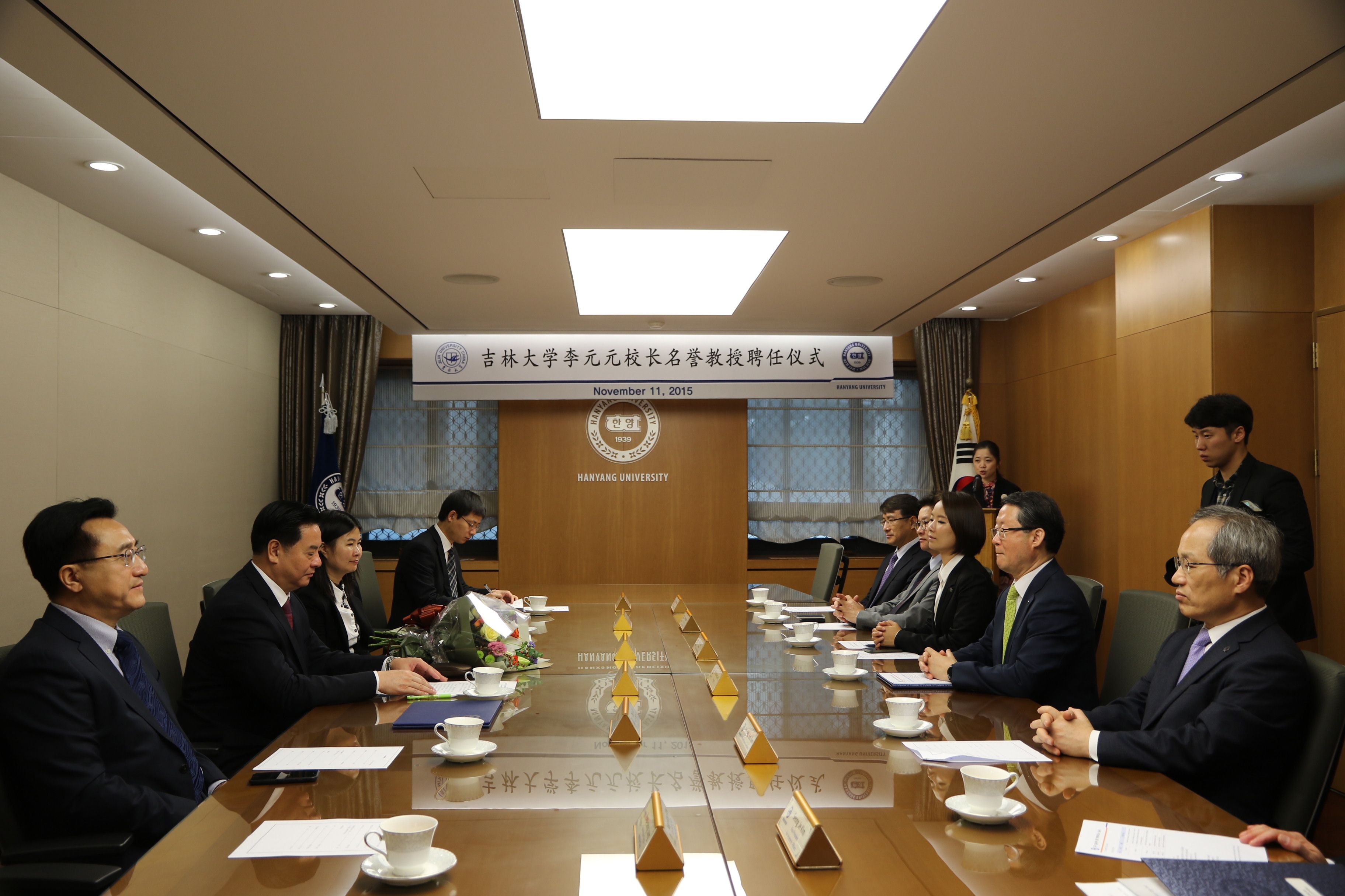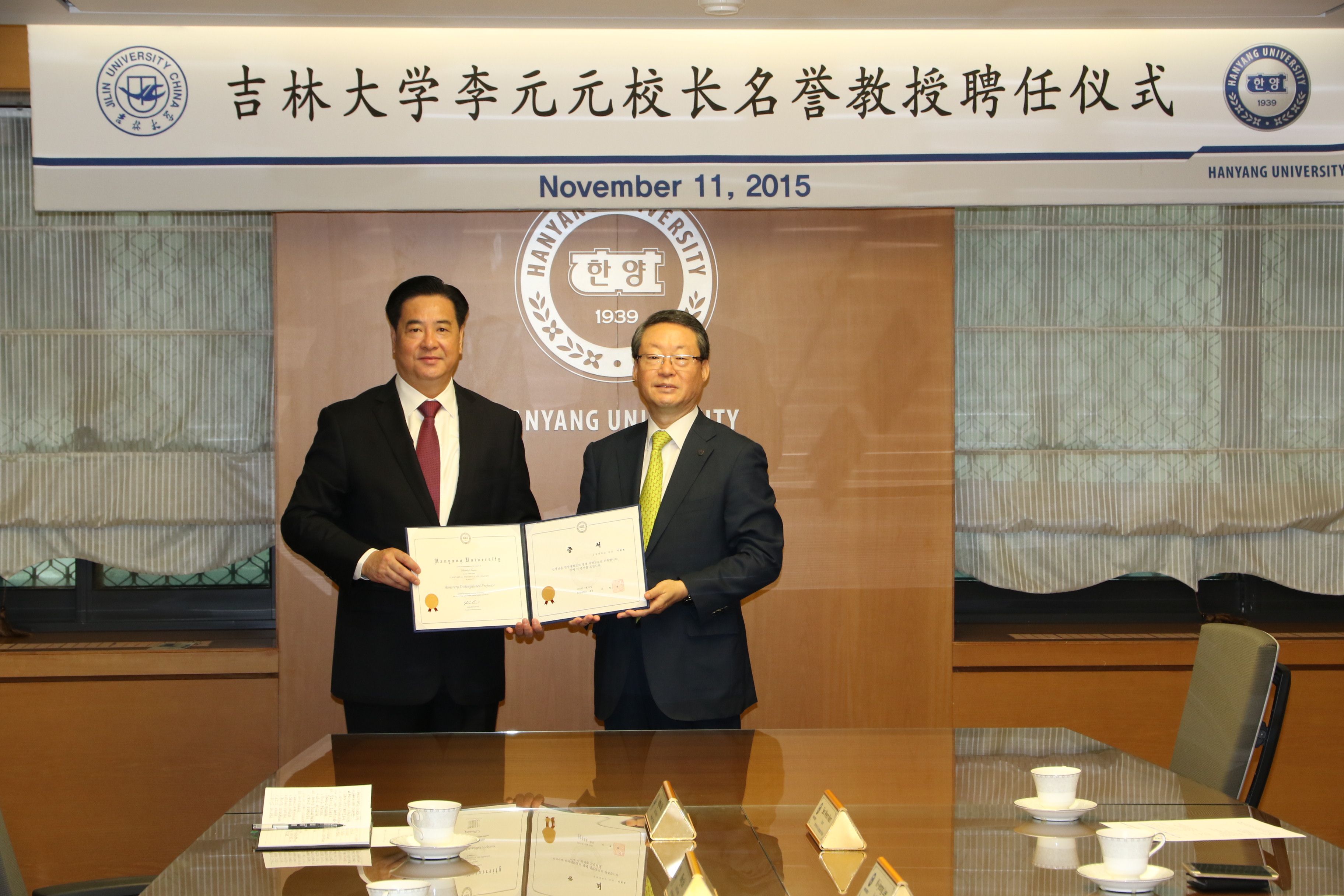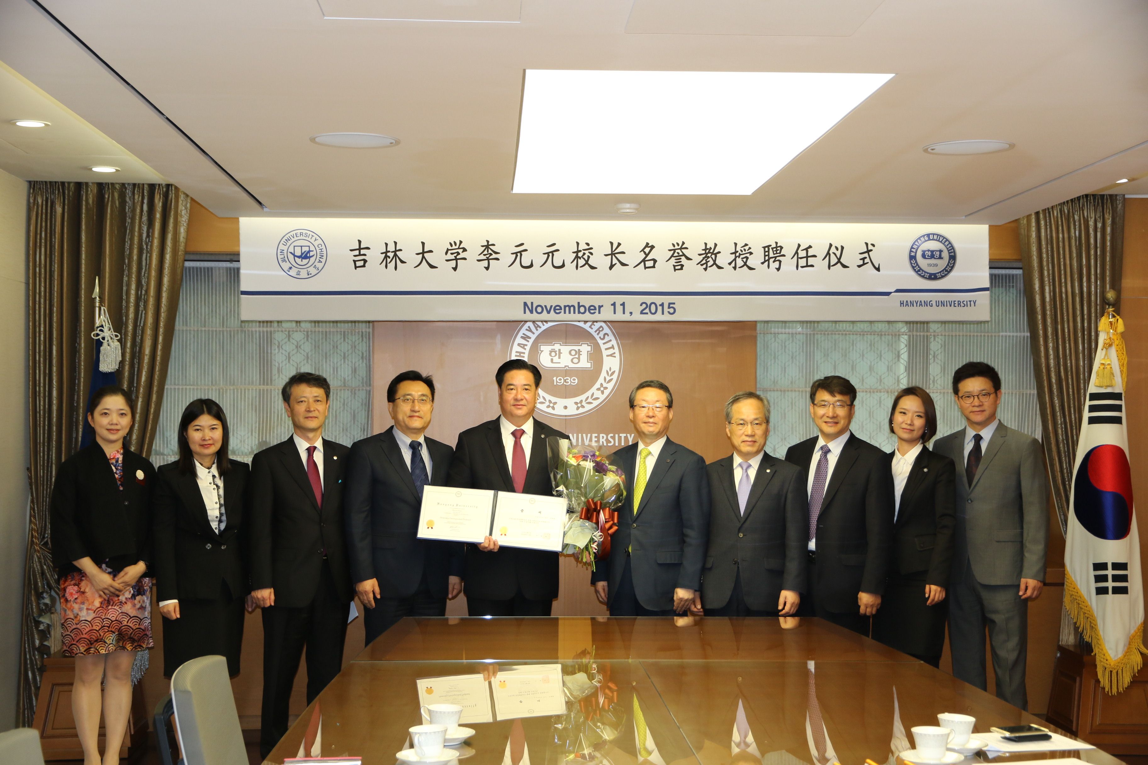 校长李元元院士为汉阳大学名誉教授。汉阳大学校长李永茂,常务副校长金会律、副校长李承哲、国际交流处处长李基晶和国际语学院院长兼孔子学院韩方院长徐元南等出席了聘任仪式。金会律介绍了李校长在科学研究领域所取得的卓越成绩以及在推动两校伙伴关系发展中所做出的巨大贡献,李永茂校长亲自为李元元校长颁发了名誉教授证书,佩戴汉阳大学校徽,并对李元元受聘汉阳大学名誉教授表示热烈的祝贺和诚挚的感谢。李元元校长在答谢词中高度评价两校关系的迅速发展,高度评价汉阳大学在科学研究和人才培养方面所取得突出成绩,对受聘汉阳大学名誉教授深感荣幸,并表示今后要在两校科研合作、人才培养和人文交流方面发挥更大的作用。