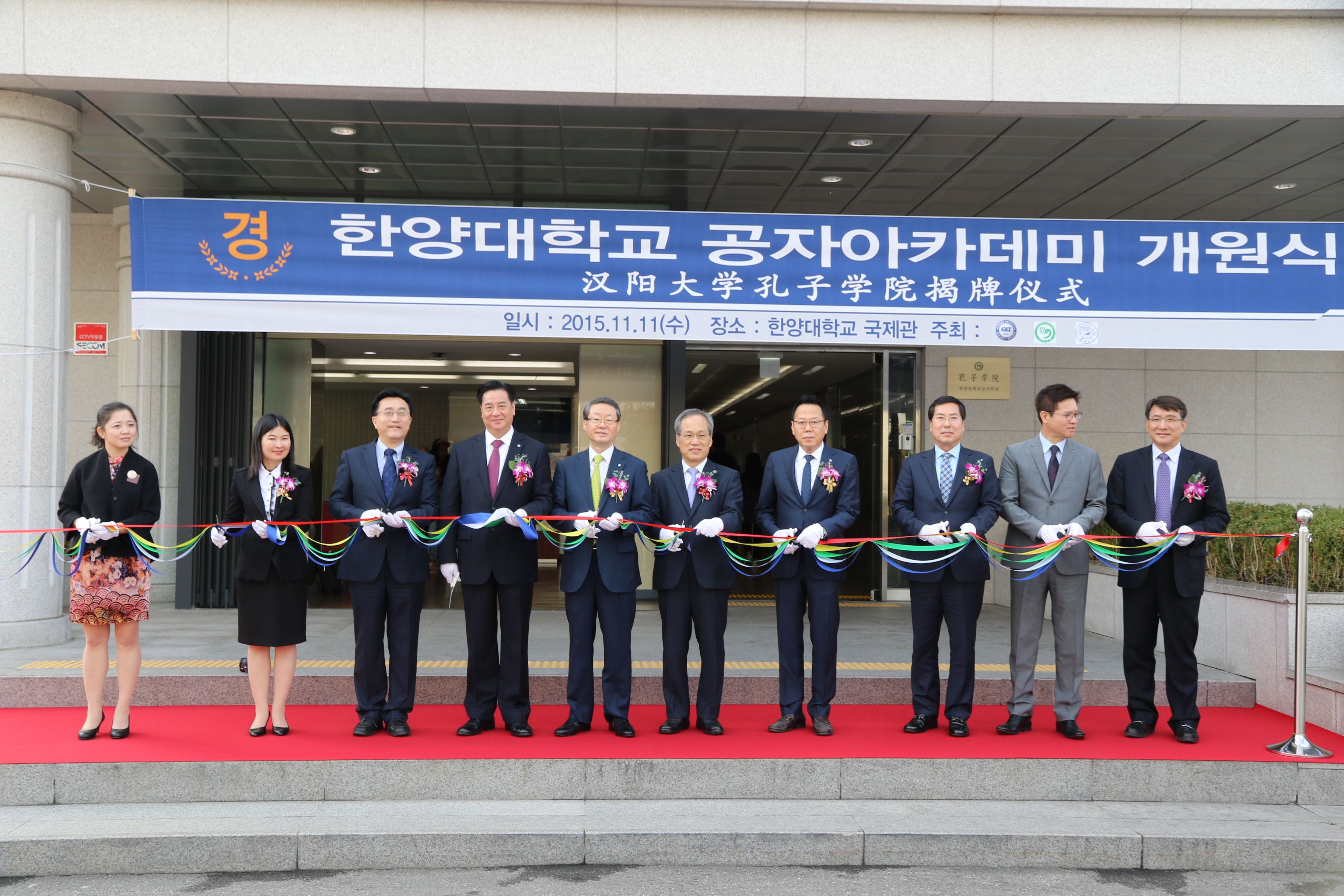 的相关负责同志出席了李校长汉阳大学名誉教授受聘仪式和孔子学院揭牌仪式。汉阳大学常务副校长金会律、副校长李承哲、国际交流处处长李基晶、国际语学院院长兼孔子学院韩方院长徐元南和国际学大学院院长兼中国问题研究所所长文兴镐等出席了揭牌仪式,并和李校长等一起为孔子学院剪彩。韩国其他大学孔院的中外方院长及汉阳大学国际语学院的中文教师和学生代表共一百余人出席了汉阳大学孔子学院的揭牌仪式。揭牌仪式后,两校还共同召开了汉阳大学孔子学院理事会首次工作会议,就今后的工作进行了细致的讨论,并通过了一系列章程和规定。