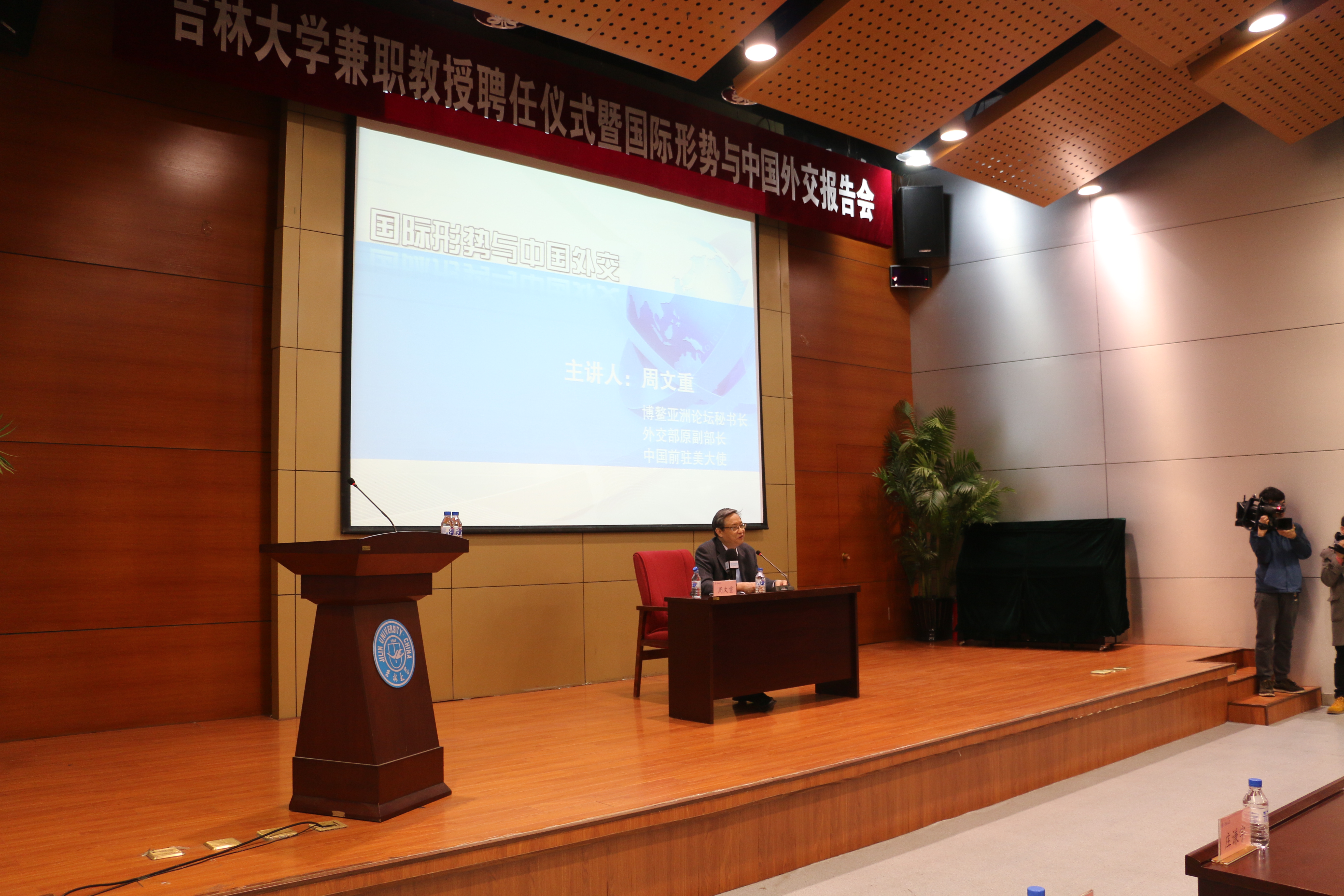 兼职教授聘任仪式暨国际形势与中国外交报告会在中心校区国际学术讲堂举行。外交部原副部长、博鳌亚洲论坛秘书长周文重受聘吉大自拍偷拍