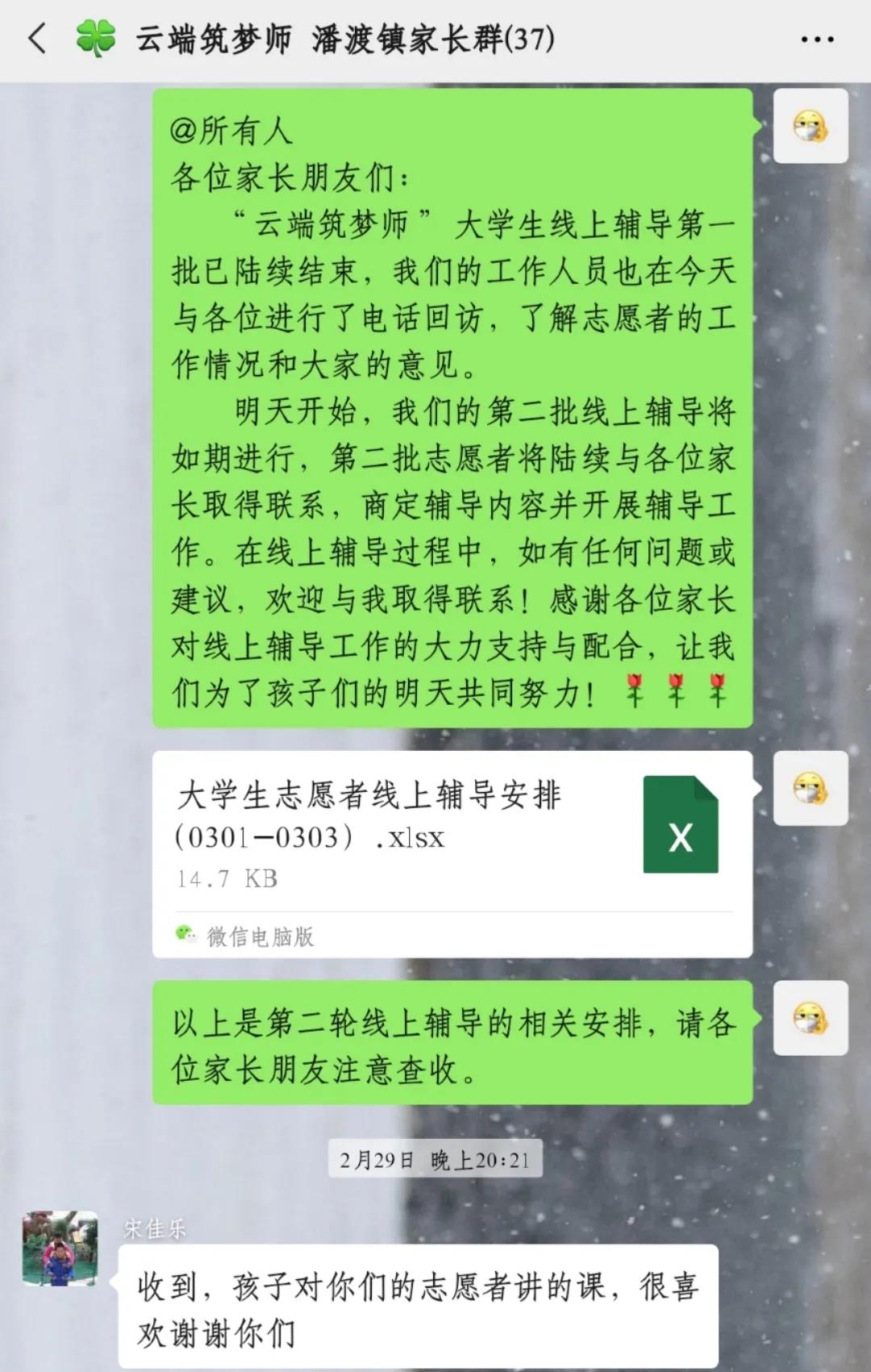 活动开始前,志愿者们根据课程安排,提前与孩子们取得联系,并根据孩子们的学习状况与实际需要,精心设计辅导内容。志愿者们在交流群里分享上课使用的资料、交流辅导心得,俨然“人民教师”的模样。工作人员也会定期与孩子家长取得联系,了解孩子线上学习情况,倾听孩子家长对线上辅导的建议。