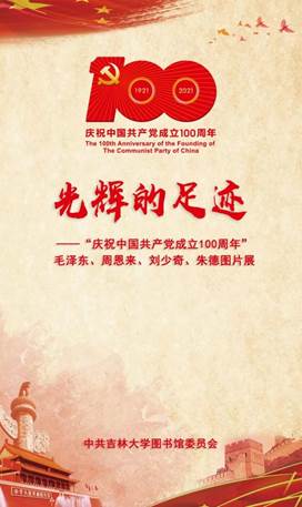 中心图书馆开展的“光辉的足迹”——“庆祝中国共产党成立100周年”毛泽东、周恩来、刘少奇、朱德图片展。