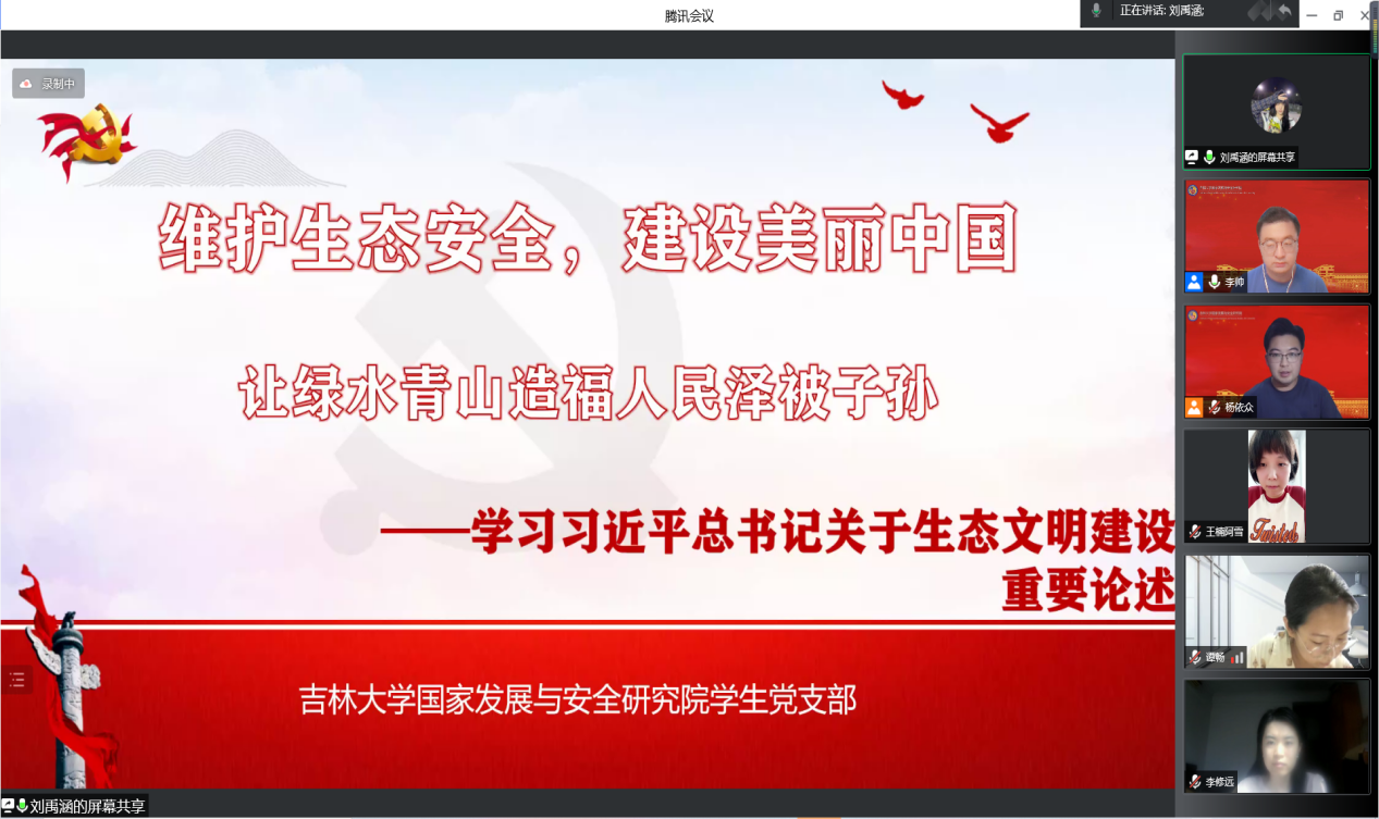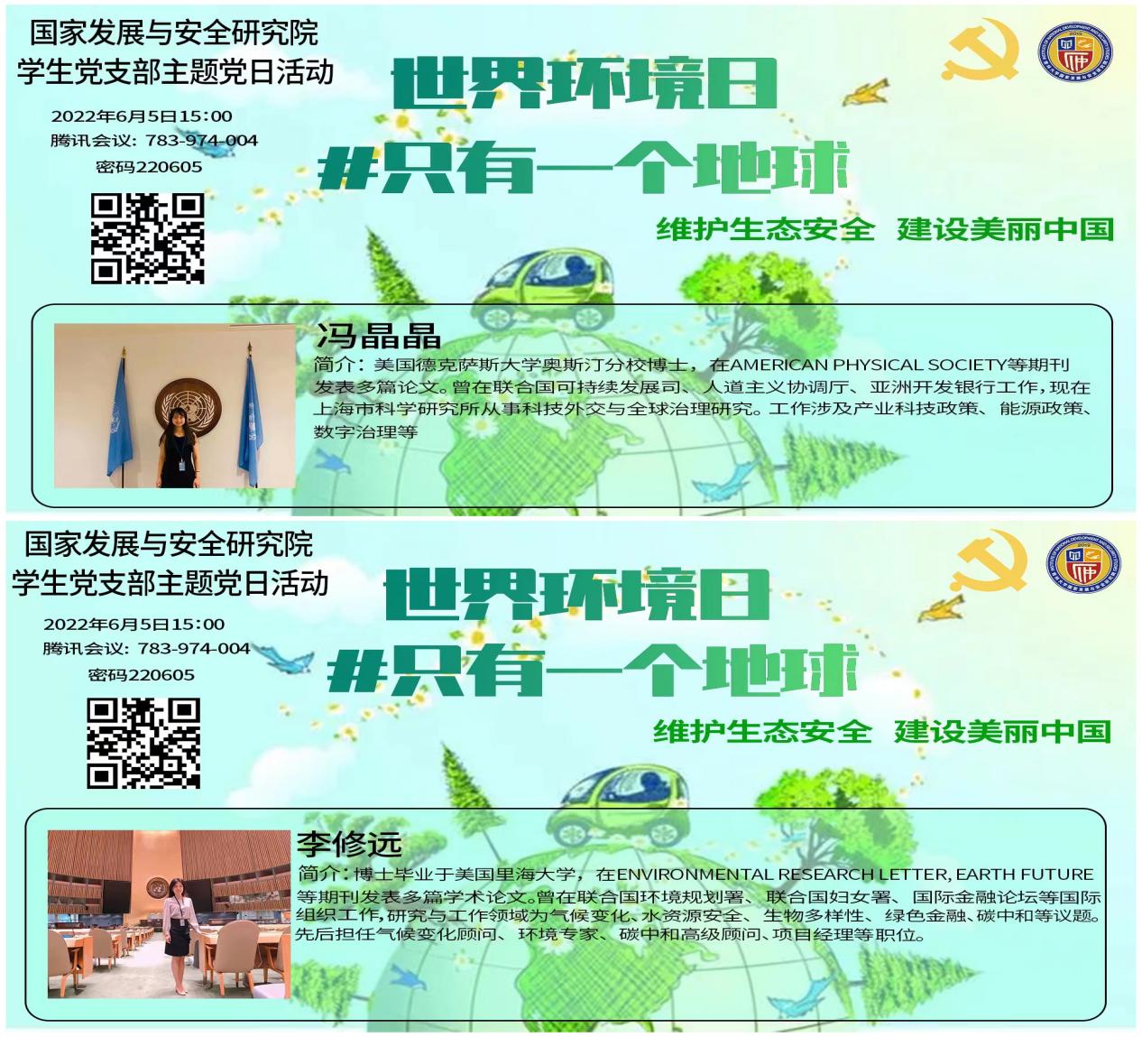 6月5日,国家发展与安全研究院学生党支部以“维护生态安全,建设美丽中国”为题召开线上主题党日活动。此次活动特别邀请原国际金融论坛环境专家、联合国环境规划署、妇女署顾问李修远博士和上海市科学学研究所研究员、原联合国可持续发展司职员冯晶晶博士后参会分享,自拍偷拍