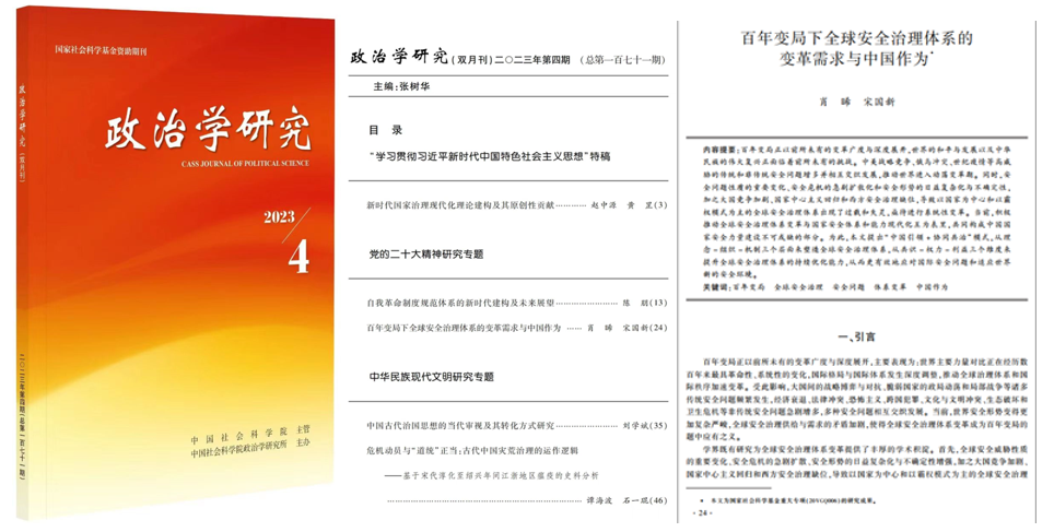 、国家发展与安全研究院院长肖晞教授团队在《政治学研究》2023年第4期发表题为《百年变局下全球安全治理体系的变革需求与中国作为》的文章。该文紧扣百年变局下全球安全治理体系为何频繁失灵却难以实现变革的重大问题,提出“中国引领+协同共治”模式,从塑造和优化两个层面推进全球安全治理体系变革。