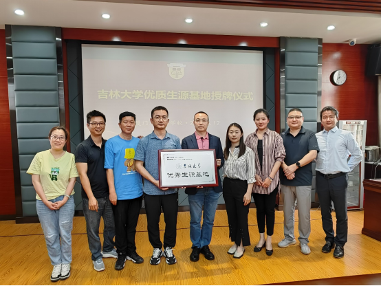 优秀生源基地”牌匾。胡靖华主任与于洪生副院长就学校生源、人才培养、报考情况等亲切交流并合影留念。