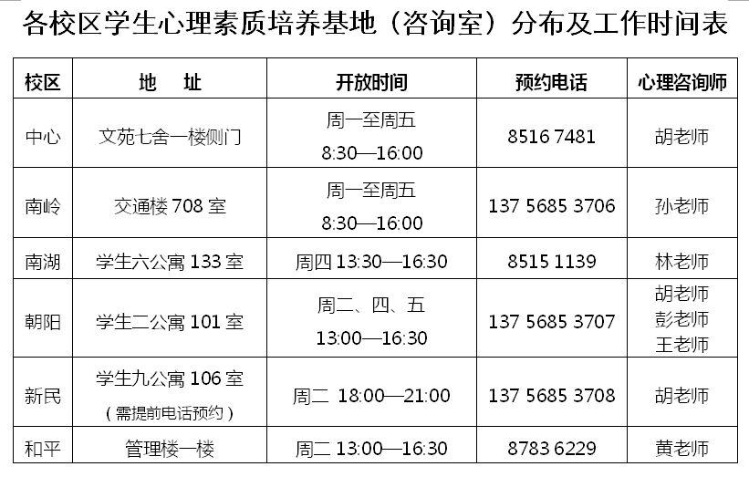 各校区心理素质培养基地(咨询室)分工及工作时间表