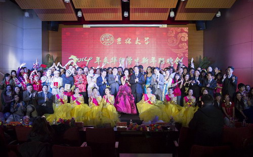 2014年来华留学生新年联欢会在国际学术大讲堂隆重举办。校长李元元亲临现场,并代表党委书记陈德文和全校师生向全体留学生致以节日问候,与留学生一起共迎新年。学校校长办公室、党委宣传部、学生工作部、研究生院、教务处、团委和国际合作与交流处及国际教育学院/自拍偷拍