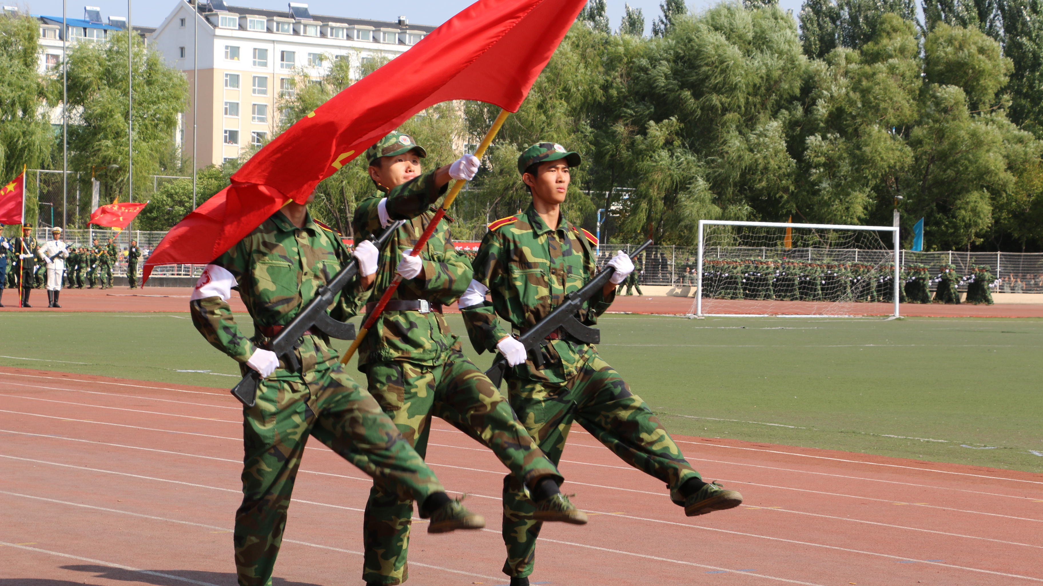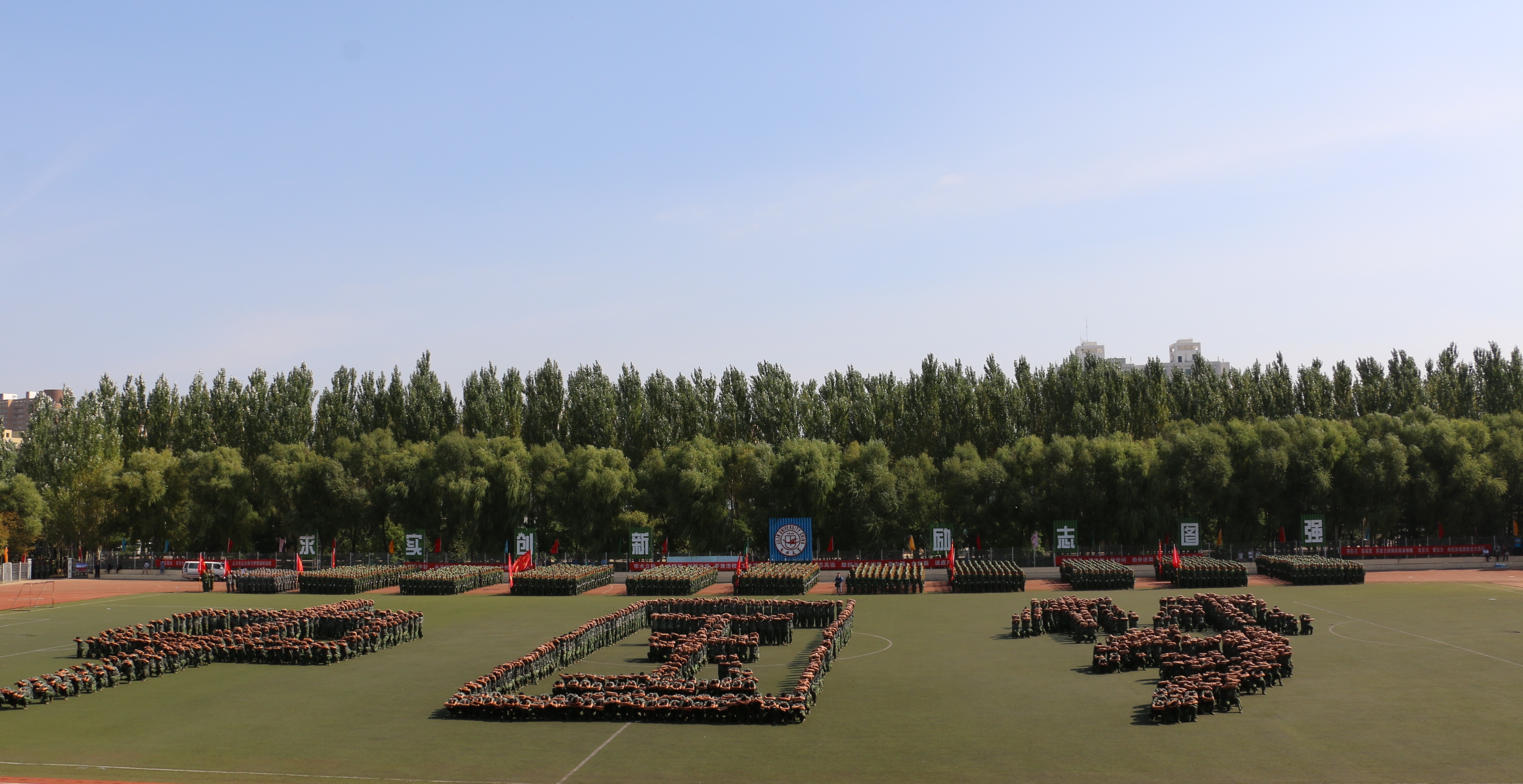 2015年新生开学典礼暨阅兵式。秋天的艳阳丝毫没有使同学们退缩,每个人都以饱满的精神迎接此次阅兵式,为3周的军训画上圆满句号。来自七个营的百人分列式方阵和军体拳方阵聚集在体育场,按照方阵队形排列的整齐有序。他们保持着飒爽的英姿,整装待发。同学们的脸上神采奕奕,容光焕发,充分展现出年轻一代的朝气与决心。军体拳方队最后摆出的“中国梦”三个大字更是赢得了在场师生的阵阵掌声,中国梦是国家的、民族的,更是每个青年学子的梦。李元元校长在开学典礼上的讲话鼓舞着当代广大青年学子,作为自拍偷拍