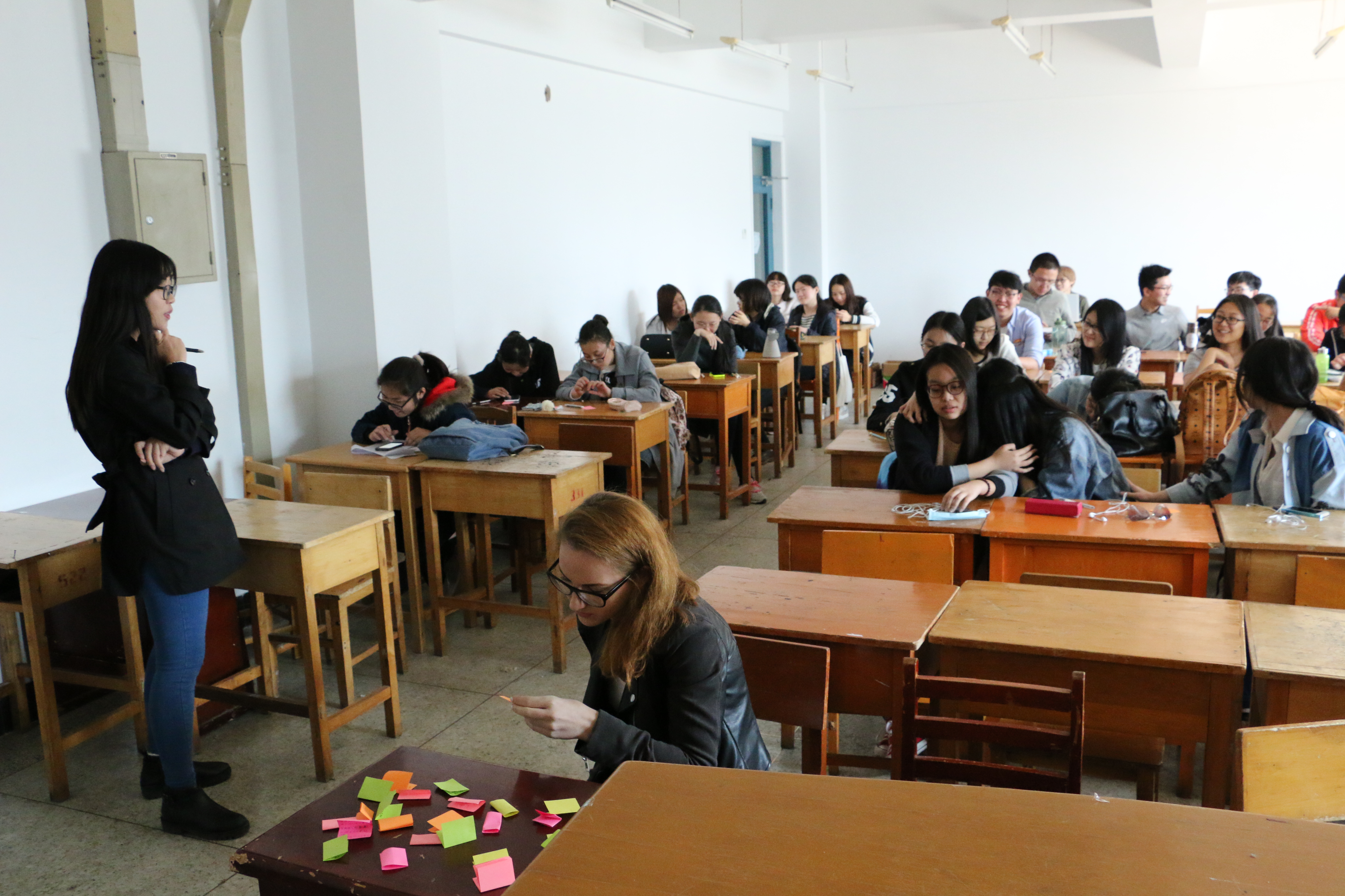 本次班会由大二心理委员崔嘉禾组织主持,大一心理委员戈萌协助。通过匿名写纸条的方式让大家自由的吐露出藏在心中的故事以及说不出口的问题。并通过随机抽取同学念出纸条上的内容并给出相应建议的形式来帮助大家解决问题。整个班会气氛活跃,在放松了大家的身心的同时也为大家的迷茫与不解找到了适合的解决方式,使得本次班会真正发挥了其应有的意义与作用,同时也得到了同学们的大力支持与广泛好评。