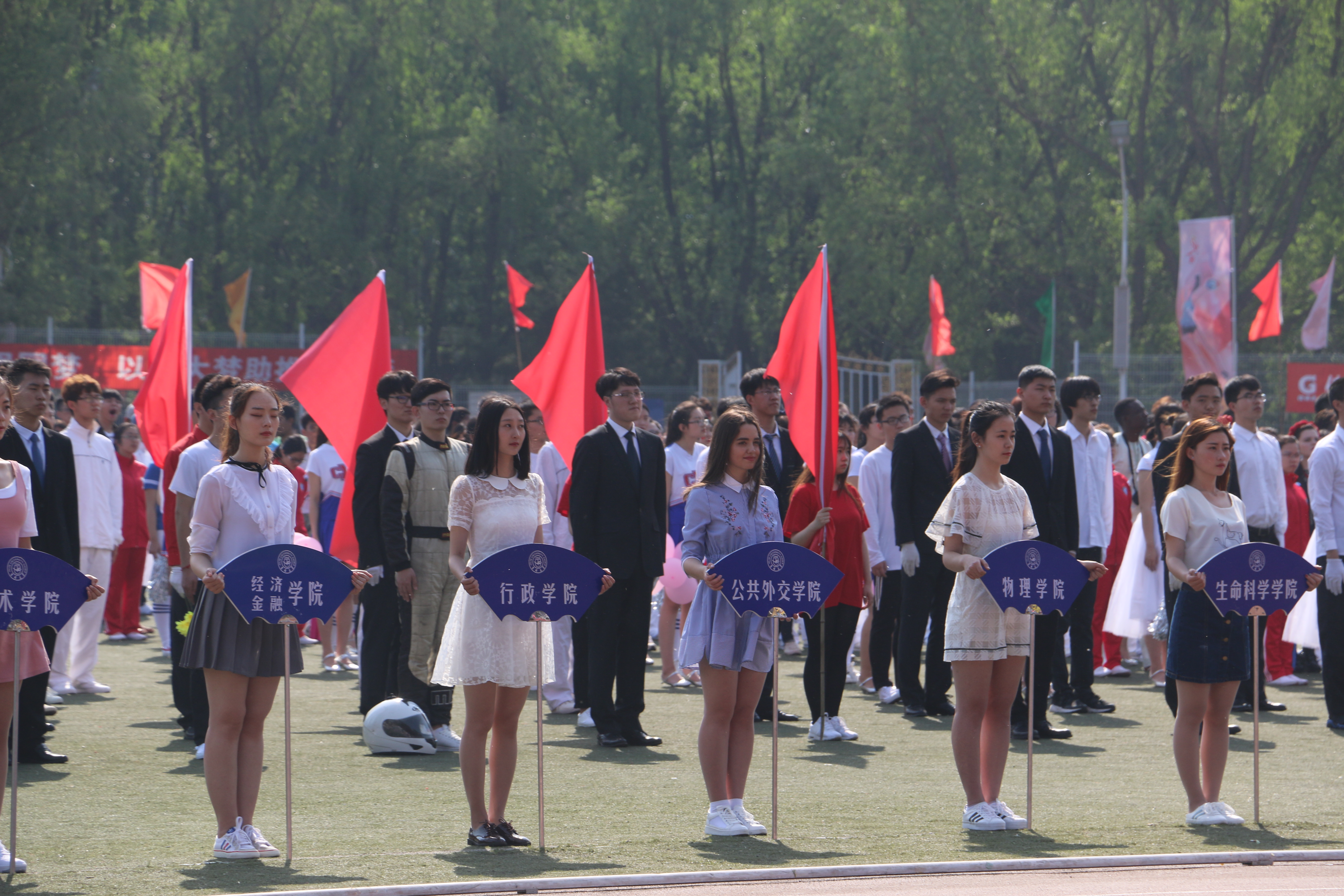 全体师生热情参与本届校园运动会。开幕式运动员方阵入场时,“吉人天下,大浪淘沙,公利兴之,外护中华”,公外学子以响亮的口号、自信的步伐进入田径场,自拍偷拍