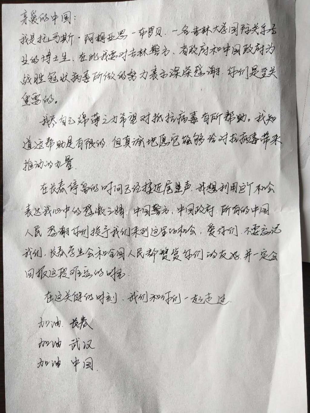 愉快的交谈过后,托马斯掏出了他用中文书写的感谢信。他在信中感谢中国政府、吉林省政府和警方为战胜冠状病毒所做的努力,并深情地写到,“在长春停留的时间接近尾声,希望尽自己的绵薄之力对抵抗病毒有所帮助,感谢中国政府、警方和所有的中国人民给我们机会来到这里,请不要忘记我们,在这艰难的时刻,我们和中国人民在一起。加油,中国!加油,武汉!加油,长春!相信在大家的共同努力下,一定能打赢这场没有硝烟的战争。”随后,前进大街派出所联系学校保卫处和学院,将托马斯的优秀事迹通报给学校,向自拍偷拍