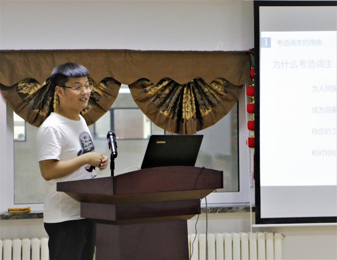 第二位分享者是成功考取定向选调的2021届硕士毕业生孔祥琦,从他幽默轻松的语句中,同学们学习到许多有关定向选调的备考知识。孔祥琦同学首先从待遇、招录政策等方面向大家普及了选调生的相关情况。随后,分享了自己准备笔试和面试的过程,给出了具体的方法建议。最后,还向大家介绍了和选调生相关的公众号等小知识。他提醒同学们备考过程中切勿心急,脚踏实地才是成功的关键。