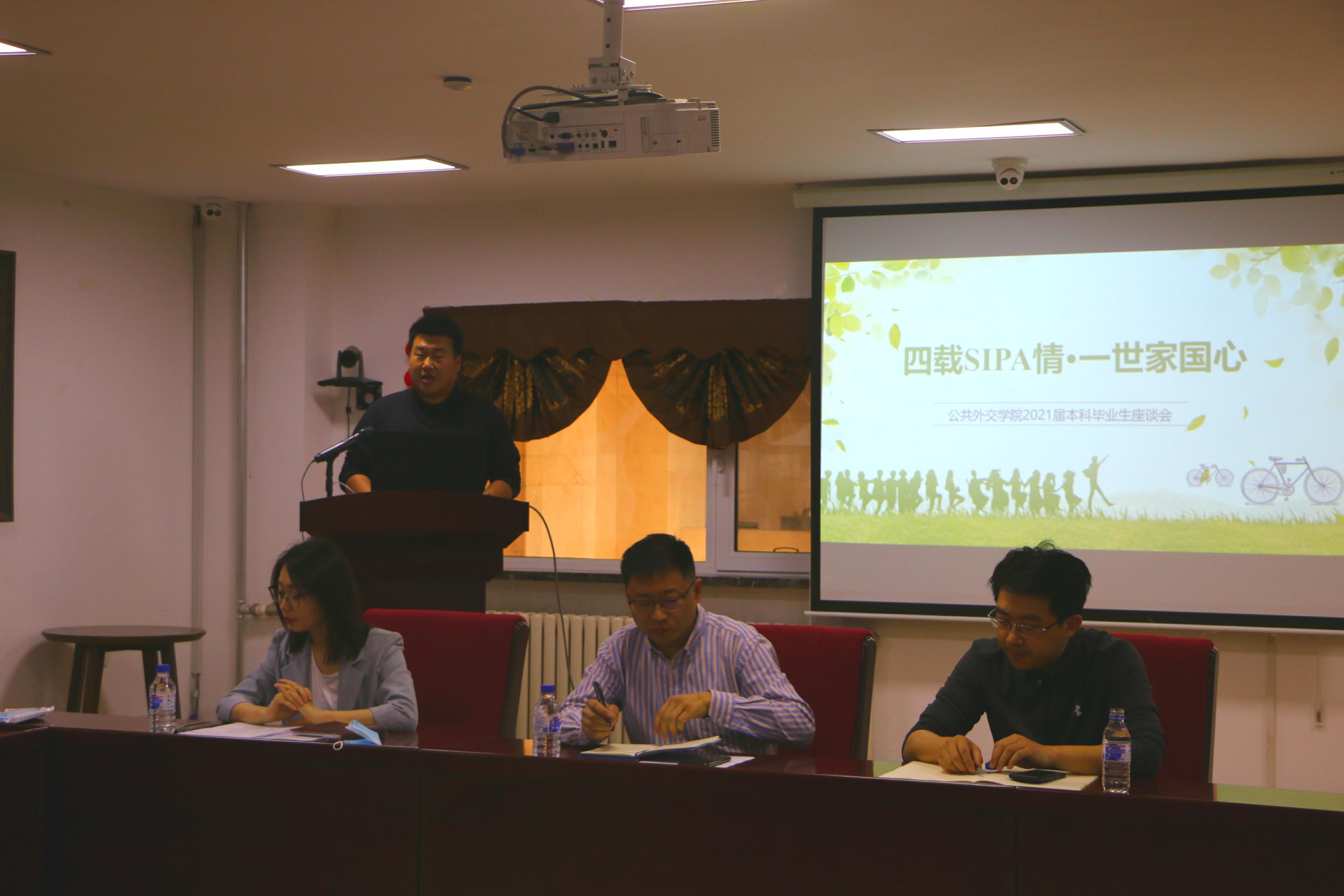 举办 “四载SIPA情,一世家国心” 2021届本科毕业生座谈会,学院党委书记杨民老师、党委副书记兼副院长王力老师和毕业年级辅导员张淑艳老师与2021届的本科毕业生们围坐一起,倾听同学们分享这四年来的感悟收获,共同展望未来发展。