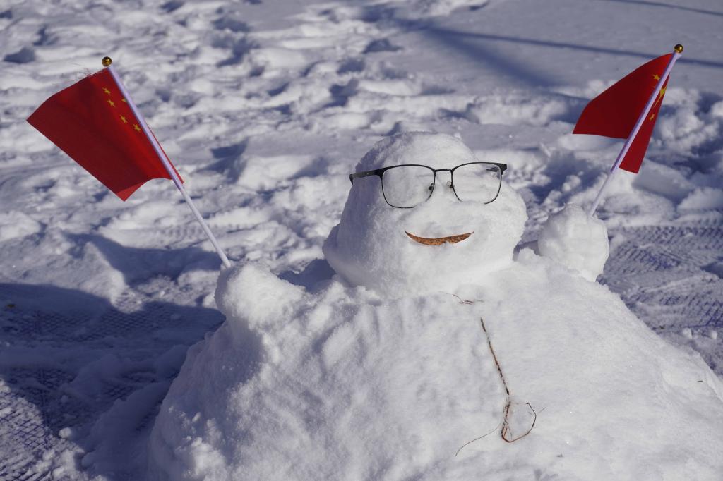 在热身之后是活动的第二项——堆雪人,在大家的创意和努力之下,一个个小半个人高的雪人迎风站立在了白雪里,眼睛是圆圆的奥利奥,手上还紧紧攥了一面党旗和国旗,红色的旗帜在风里飘飘摇摇,鲜艳又明媚。