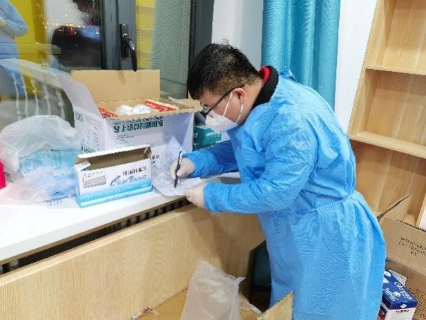 樊鸿刚老师负责管理北苑四公寓西区约2500名研究生。每日负责组织三餐和饮用水发放,防疫物资和生活物资的接收和发放,给同学们送药,组织各学院、各楼层的志愿者、党员学生开展志愿服务工作,统计和上报各类信息,处理楼内突发事件等等。