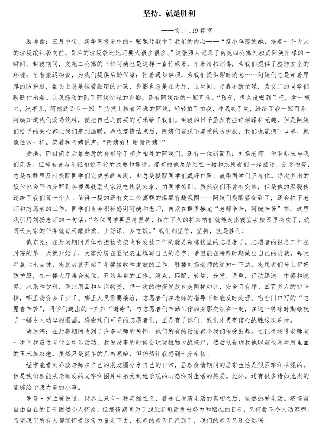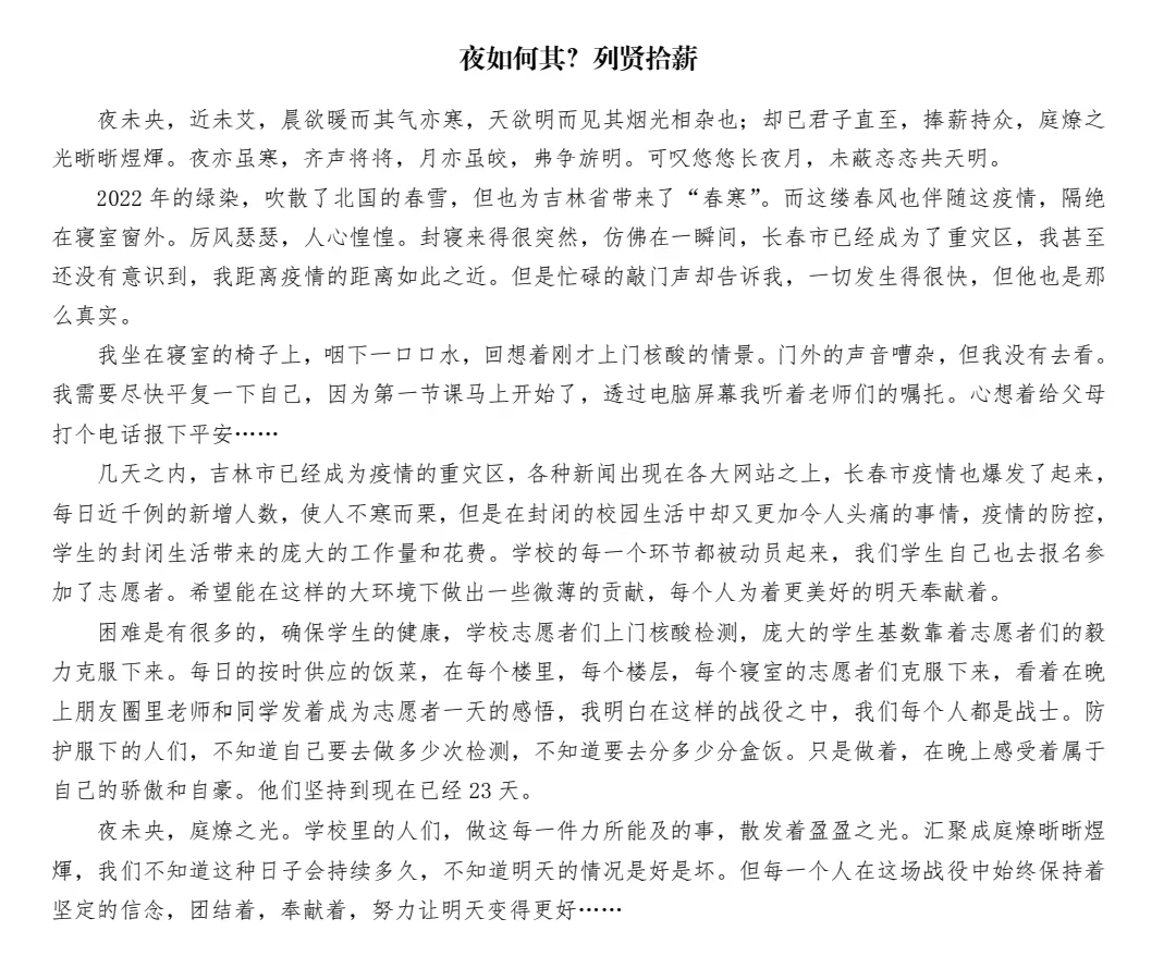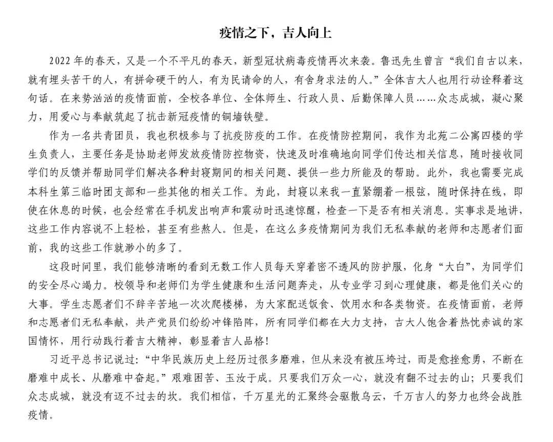 此次活动中,同学们积极响应,纷纷落笔,书写下了自己的见闻和感悟。札记虽短,却诉说着同学们内心中最真挚的情感;冬季虽长,却总有春暖花开的季节。在本次征文活动中,各年级同学们热情参与,用真诚且细腻的语言讲述着自己的经历与感受,充分表达了对所有奋斗在抗疫一线的人们的谢意和对战疫胜利的信心,展现了吉大学子热忱赤诚的家国情怀和积极阳光、奋发向上的青年风采。