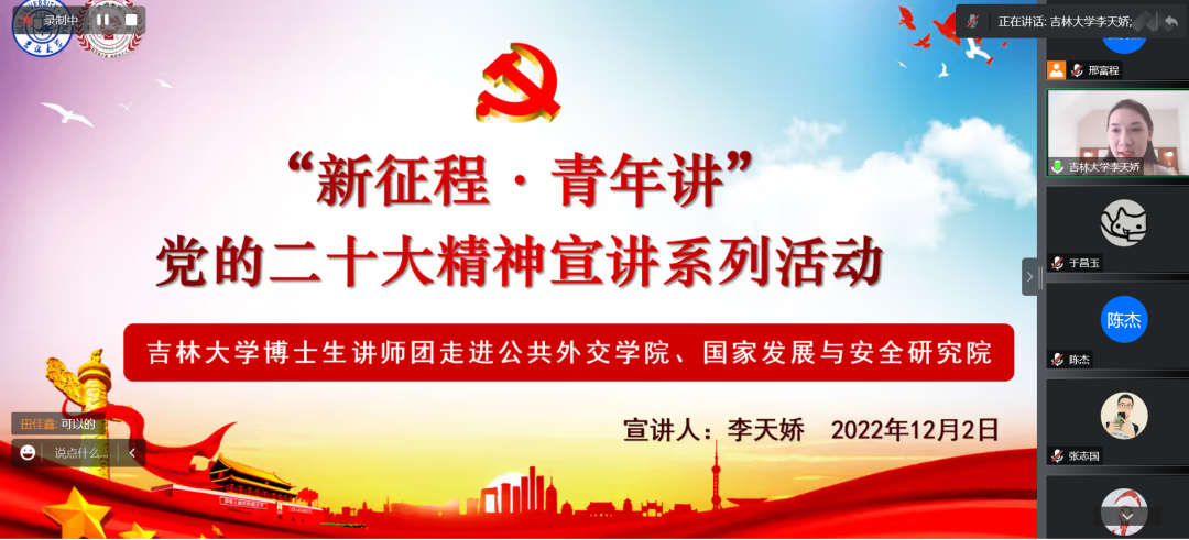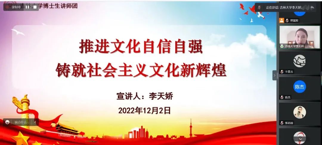 博士生讲师团讲师李天娇博士于线上开展党的二十大精神理论宣讲活动。本次宣讲的主题是“新征程•青年讲——推进文化自信自强 铸就社会主义文化新辉煌”。