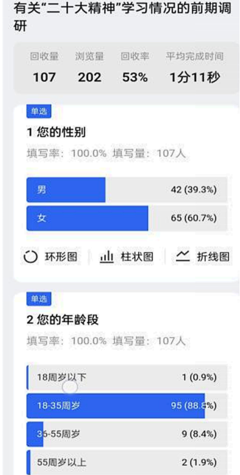 在前期准备阶段,全队通过朋友圈、QQ空间等相关社交平台开展了以“对二十大的了解程度”和“具体知识考察”两大版块为主要内容的问卷调查。在回收了大量问卷数据后,全队成员共同对调查结果进行了严谨科学地研讨分析。