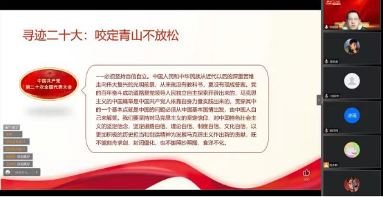 2023年2月7日15时,由郑含婷同学担任主持人,孟蕾同学担任宣讲人,实践团队通过腾讯会议组织展开了一次专题宣讲活动。宣讲队根据在线问卷的调查结果,从党的二十大主题、党的二十大报告具体内容、党的历史成就、未来发展规划以及中国式现代化等相关问题入手,通过宣讲活动解答了相关问题,增进了参会者对党的二十大相关精神以及内容的了解。