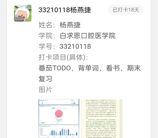 很感谢这次的打卡活动,它让我更加有效的利用了时间,培养了我良好的学习和生活习惯,帮助我摆脱了迷茫与困惑。很开心自己能坚持到活动结束,在这21天里我收获颇丰,希望日后任务能变成习惯,带着自律继续我的大学生活。