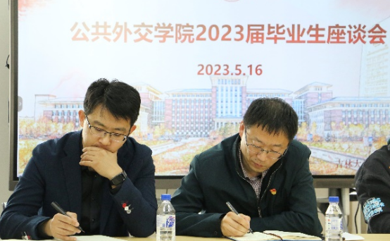 在吕振羽楼818多功能厅召开了2023届本科毕业生座谈会。学院党委书记杨民、党委副书记兼副院长王力、学生办公室主任张淑艳及教学办公室主任孟翔冲与2023届本科毕业生相聚一堂,畅谈在校收获与感想,为学院育人工作建言献策。