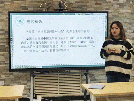 梁嘉栩同学为大家介绍了思源计划的具体内容。她从“思源计划介绍”、“选拔流程”、“我与思源”和“互动提问”四个方面进行分享,重点介绍了思源计划“受助、自助、助人”的核心价值理念,与同学们交流了自己在选拔、面试中的经验和心得。她就思源计划中为社会服务的实践活动与大家进行分享,阐述了加入思源计划对提升自身素质的积极作用。最后,梁嘉栩同学鼓励大家积极加入思源,投身社会实践,在一次次的历练中拓展视野,塑造自我。