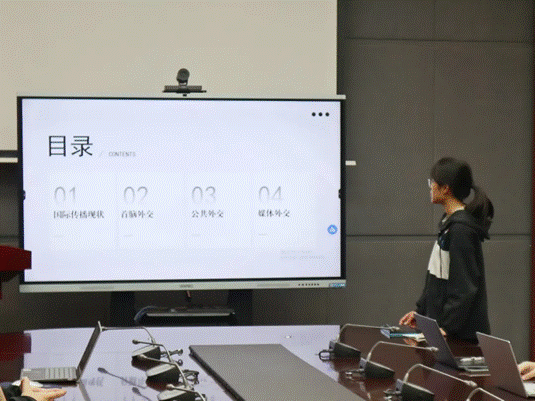 黄荣禹同学从外交学的专业角度出发,阐述了“新质生产力”的国际传播现状,用具体事例分析了在首脑外交、公共外交、媒体外交等国际公关活动中传播“新质生产力”理念的具体举措,并强调了官方声音在国际传播过程中的客观、权威和公正的重要性。她进一步介绍说明了联合国决议条款撰写标准用语,强调了在公共外交中语言、结构和内容等方面的严格要求。