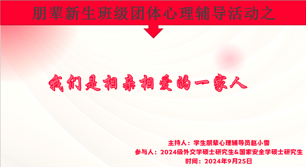 、国家发展与安全研究院于2024年9月25日吕振羽楼818室成功举办了以“我们是相亲相爱的一家人”为主题的研究生新生班级团体心理辅导活动。此次活动旨在帮助新生快速适应新环境,增进相互了解,建立深厚友谊,并增强团体凝聚力。