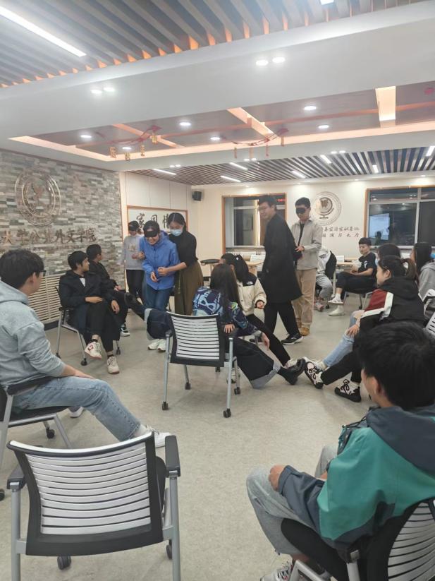 在活动主体环节,“信任之旅”“人体字母””创作大赛“和”正话反说“这一系列趣味性、合作性的小游戏推动本次活动走向高潮。“盲人”和“引路人”的相互配合的旅途考验着大家的信任感和默契度;充分发挥想象力和创作才能的故事创作大赛让大家沉醉其中;”正话反说“和”人体字母“则见证了大家极好地团队协作能力和灵活反应能力。活动中,新生们笑声不断,气氛热烈,充分展现了他们的青春活力和团队精神,这既是团队的合作,也是心灵的交流。