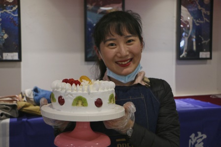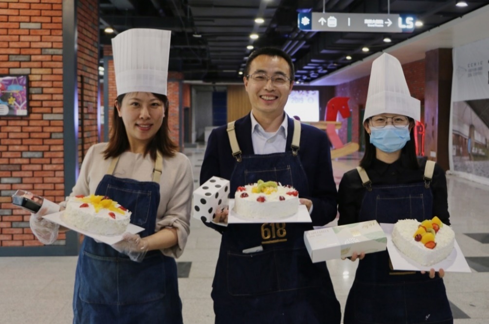 接着,老师们开始动手制作自己的奶油蛋糕。金黄的蛋糕坯、洁白的甜奶油、新鲜的水果……老师们在烘焙师的指导下精心制作,释放紧张工作压力的同时,也在蛋糕上展现着自己的奇思妙想。